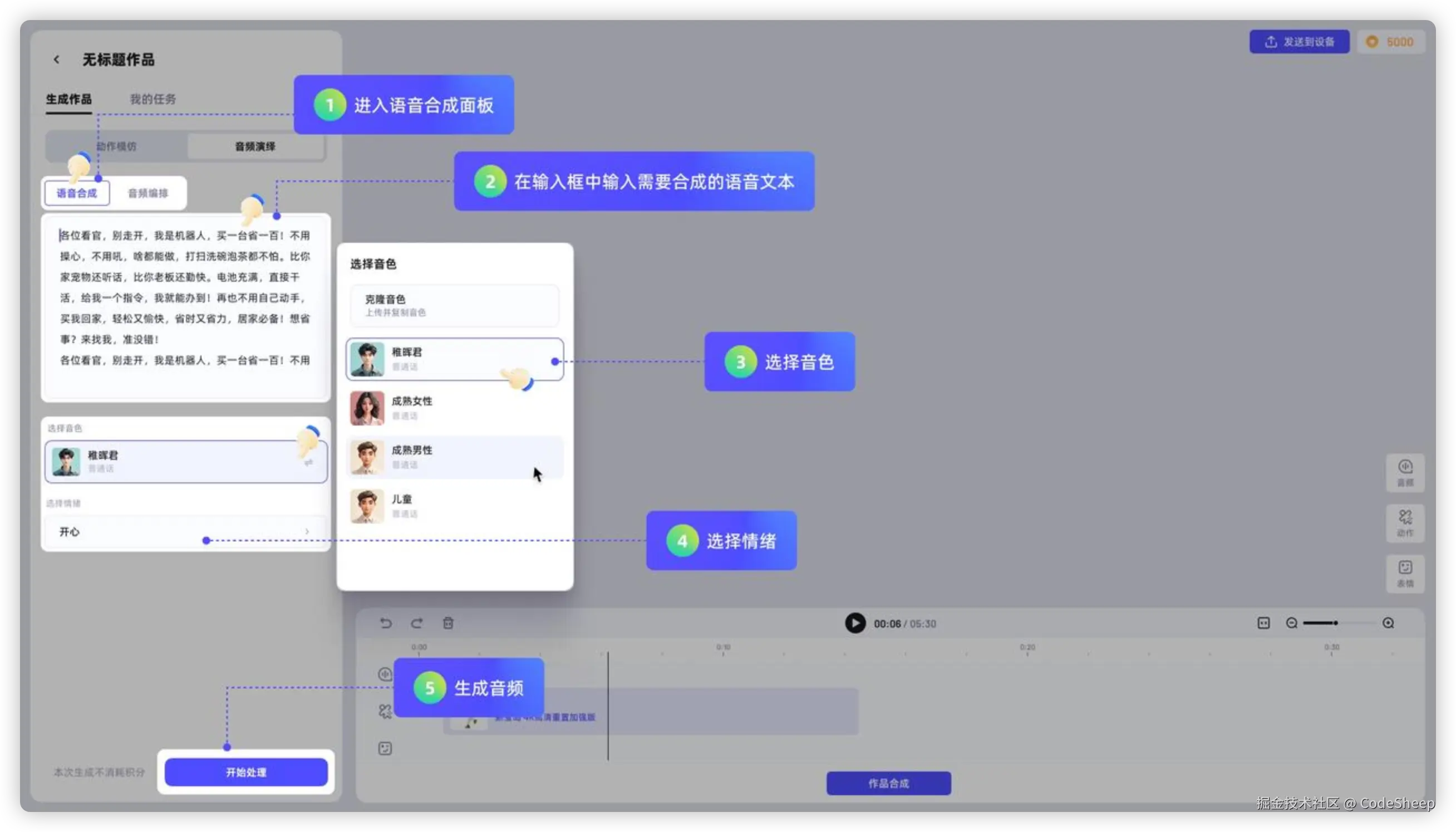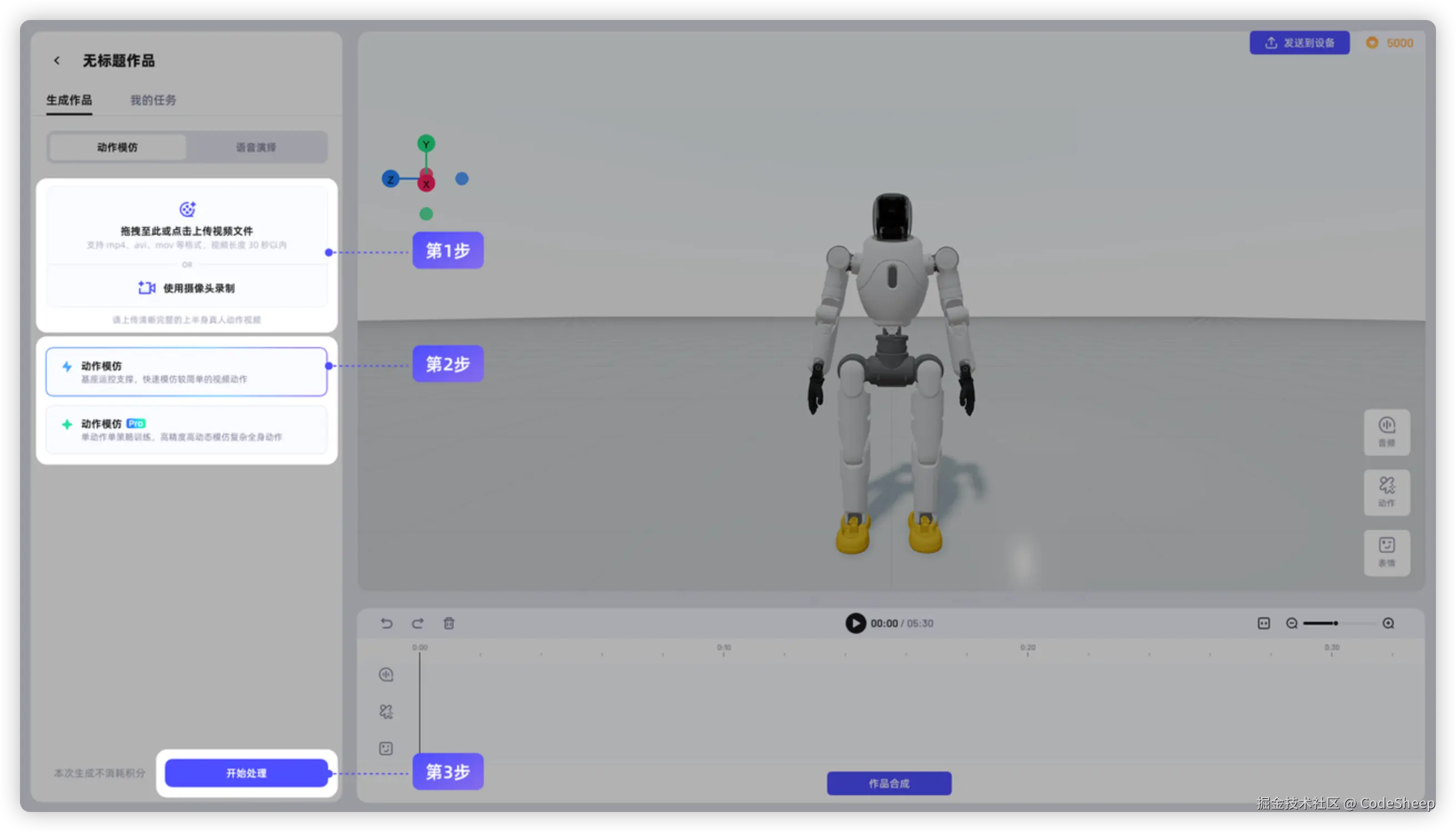 当用户上传文本内容或音频后,平台会智能识别语义,并生成与语音内容匹配的机器人肢体动作与表情。