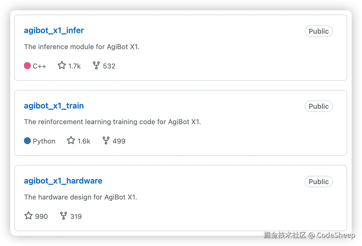 - 结构设计资料,包括BOM清单、整机STEP、整机图纸、装机SOP(github.com/AgibotTech/agibot_x1_hardware)