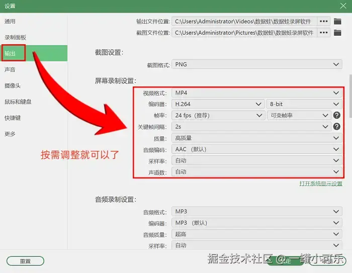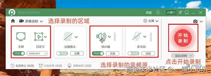 步骤2:进入录制准备环节,可通过拖拽边框划定录制范围。在音频设置栏中,勾选 “系统声音”(捕捉设备内部音效)与“麦克风”(收录环境人声) 。在 “输出设置” 里,能根据存储空间大小和画质需求,调整视频的分辨率、帧率及编码格式。所有参数确认无误后,点击红色录制按钮就能开始录制啦。