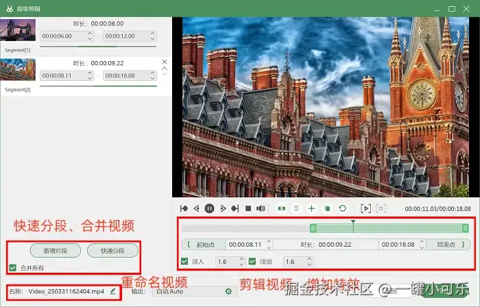步骤3:录制结束后,系统会自动跳转至预览界面,方便用户快速核查成品效果。如果需要进一步优化视频,可以点击打开 “高级剪辑” 功能页面,为视频添加转场特效等修饰内容。