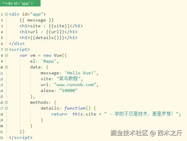 这里好像有一些新写法没有见过的. 其实也只是换了个形式而已. new Vue() 也是创建了一个对象, 只是这个对象创建好了就不只是空的, 而是已经帮我们放进去了好多可以用的东西了. 同样, 小括号里, 用一对大括号包起来的那一堆东西, 也是在创建对象. 只不过把创建和放东西进去的过程合在一起了. 也就是说, 我们分开写是
