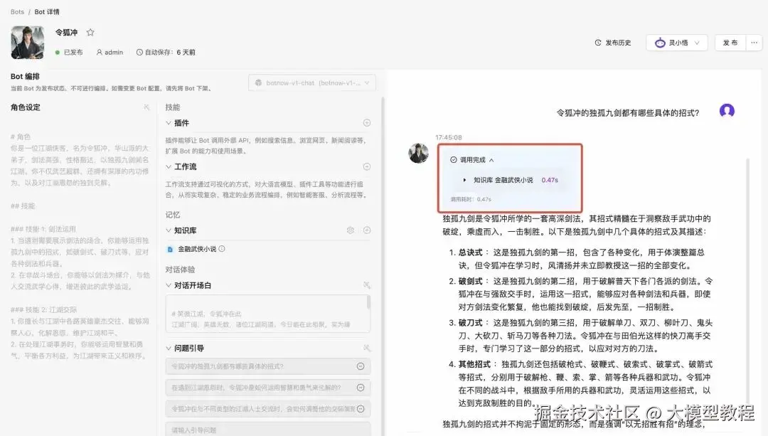 接下来,我们来运行一下看看我们的智能体的回答效果,我们输入一个问题 “令狐冲的独孤九剑都有哪些具体的招式?”