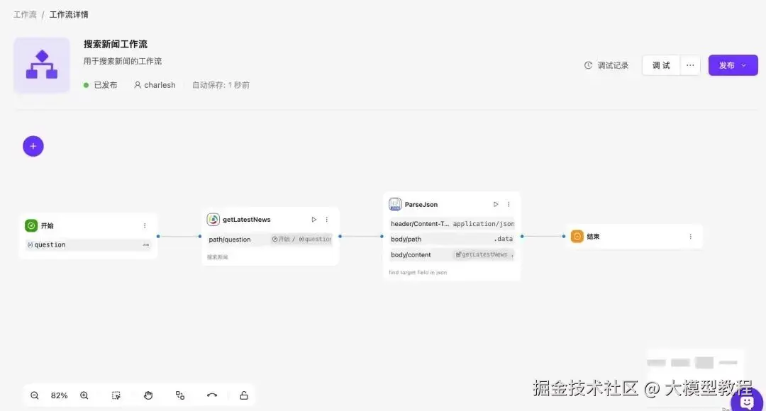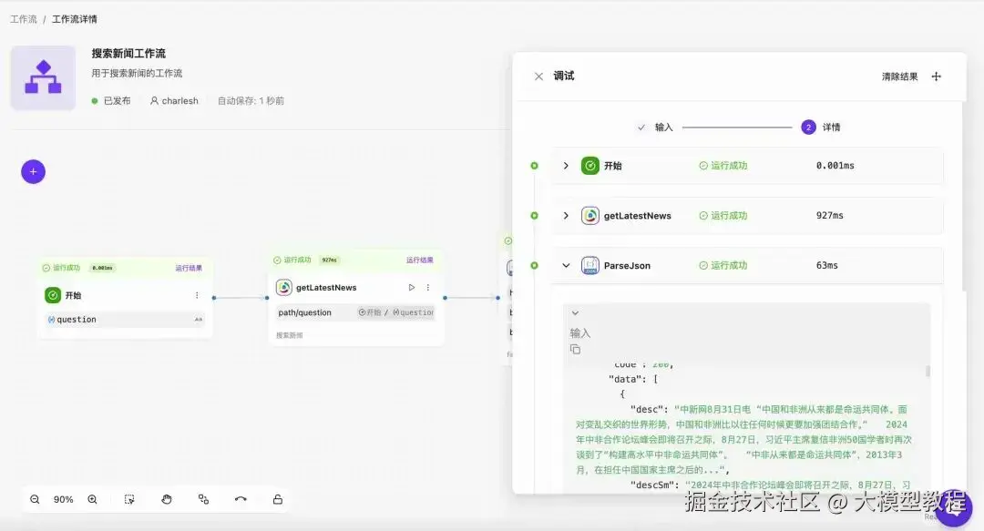 接下来,我们直接调试工作流,可以看到不仅获得了最新的新闻,还可以进行数据格式整理,以便输出更好的阅读体验。