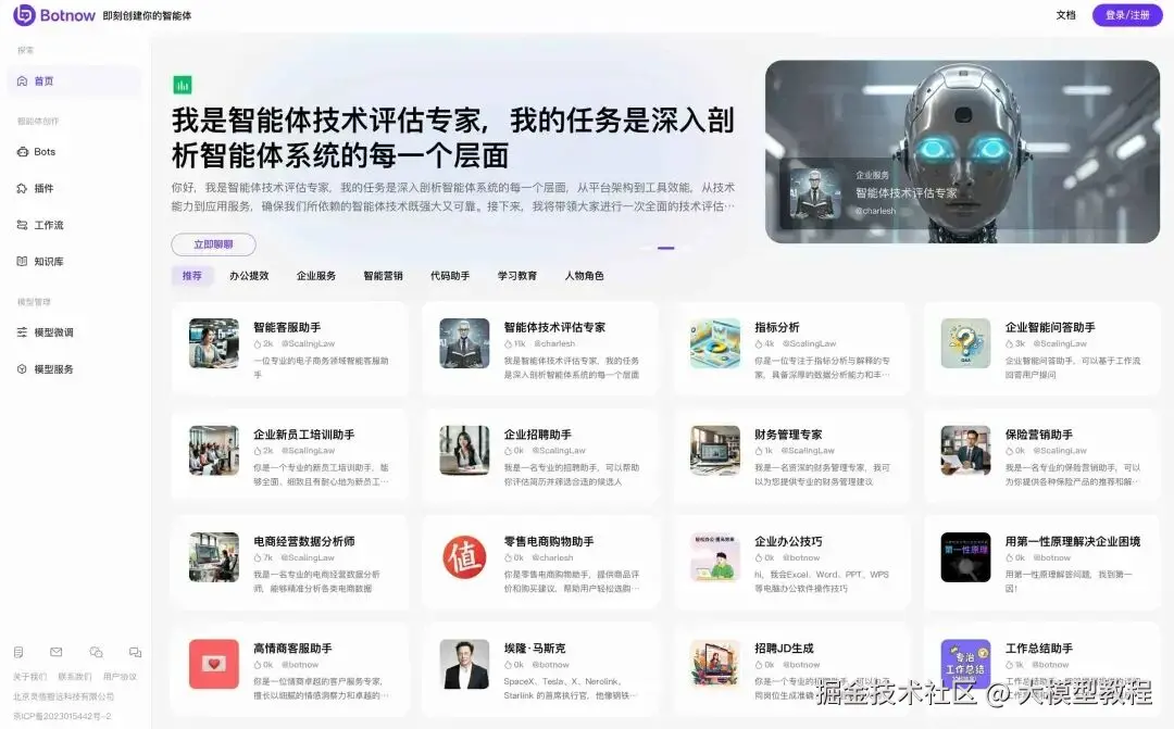 如果你想要开发一个 AI 智能体(AI 应用),已经比大模型爆发的初期方便太多了,随着 AI 应用需求的持续火热,智能体开发平台层出不穷。比如 Botnow 智能体开发平台,Botnow 抽象和封装那些被高频使用的模块,如记忆能力、规划能力、RAG 能力、大模型调用等。在 Botnow 智能体开发平台,用户可以通过插件、知识库、工作流等方式快速、低门槛打造高质量的智能体,并支持发布到第三方平台,同时也支持 API 调用和 Web SDK。