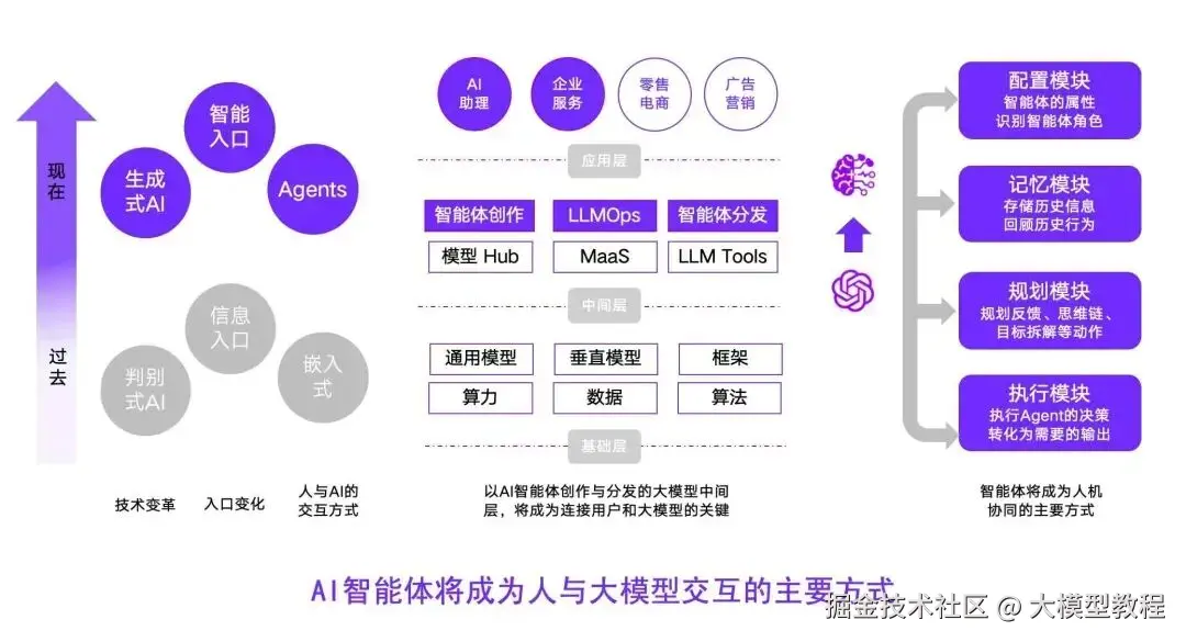 随着人工智能技术的发展,智能体(AI Agents)逐渐成为人与大模型交互的主要方式。智能体能执行任务、解决问题,并提供个性化服务。其关键组成部分包括规划、记忆和工具使用,使交互更加高效、自然。智能体的应用涵盖专业领域问答、资讯整理、角色扮演等场景,极大地提升了用户体验与工作效率。借助智能体开发平台,用户可以轻松打造定制化AI应用,推动AI技术在各领域的广泛应用与深度融合。