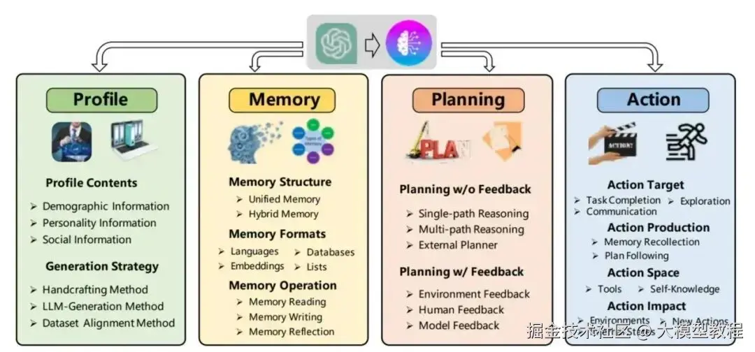 如上图所示,在基于大模型的智能体中,大模型的充当着智能体的 “大脑” 的角色,同时还有 3 个关键部分: