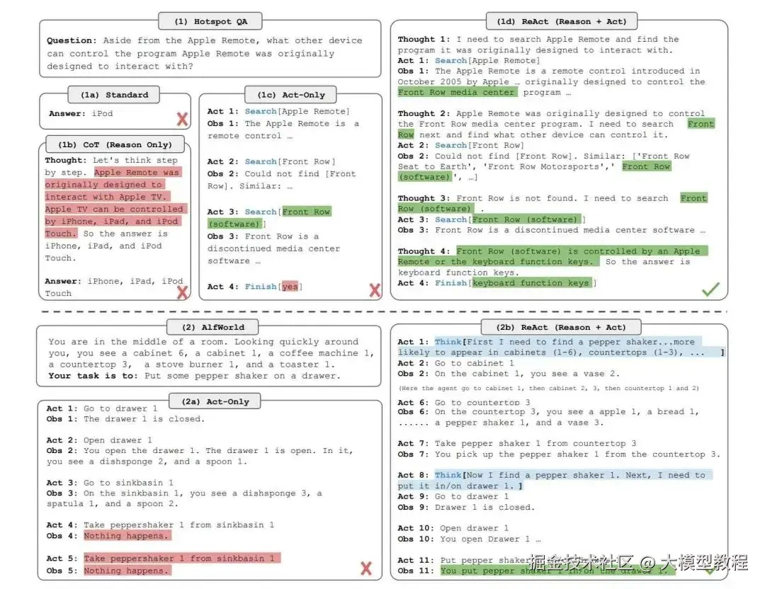 为什么结合推理和行动,就会有效增强 LLM 完成任务的能力?ReAct 的论文例子通过与简单的百科 API 交互,克服了思维链推理中常见的幻觉和错误传播问题,并生成类似人类的任务解决轨迹,比没有推理痕迹的基线更具可解释性。