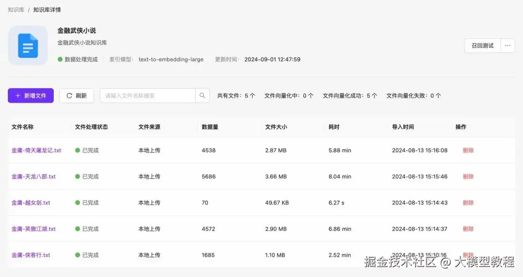 我们首先创建一个 “金庸武侠小说” 知识库,直接将小说的 txt 文本或 PDF 文档上传,如下图所示。