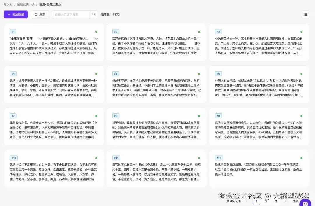 几分钟后,文件进行分段处理并进行向量化,这个过程是转化为计算机理解的语言,方便识别和检索我们之前上传的文本信息。我们点击 “金庸 - 笑傲江湖.txt”,查看小说已经被分成了 4572 个段落。