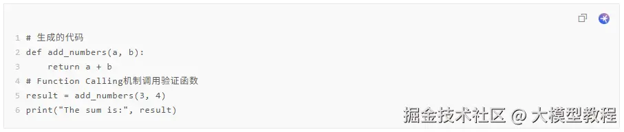 假设有一个语言模型,用户请求生成一个简单的 Python 程序来计算两个数的和。模型不仅生成代码,还通过 Function Calling 机制调用一个函数来验证代码的正确性。