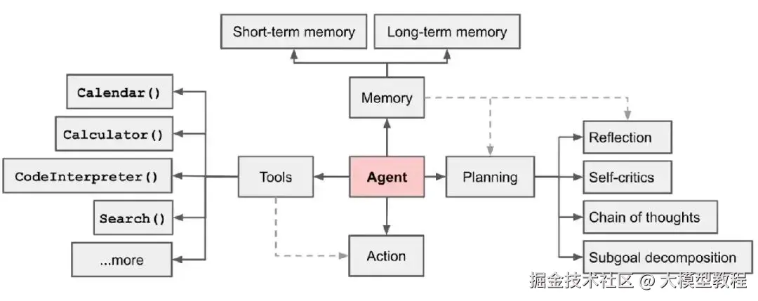 在基于大模型的智能体中,大模型充当着智能体的 “大脑” 的角色,同时还有 3 个关键部分:规划(Planning)、记忆(Memory)、工具使用(Tool use)