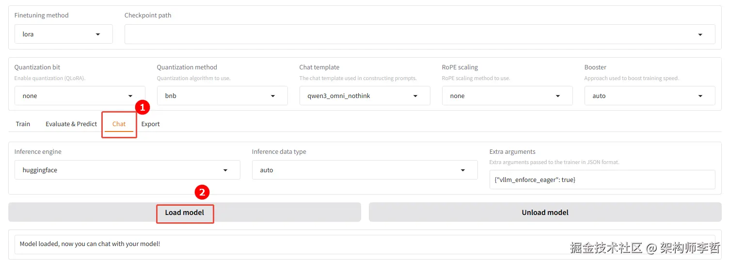 a. 单击“chat”页签(如图①),然后直接单击“加载模型(Load model)”按钮(如图②),加载原生模型。