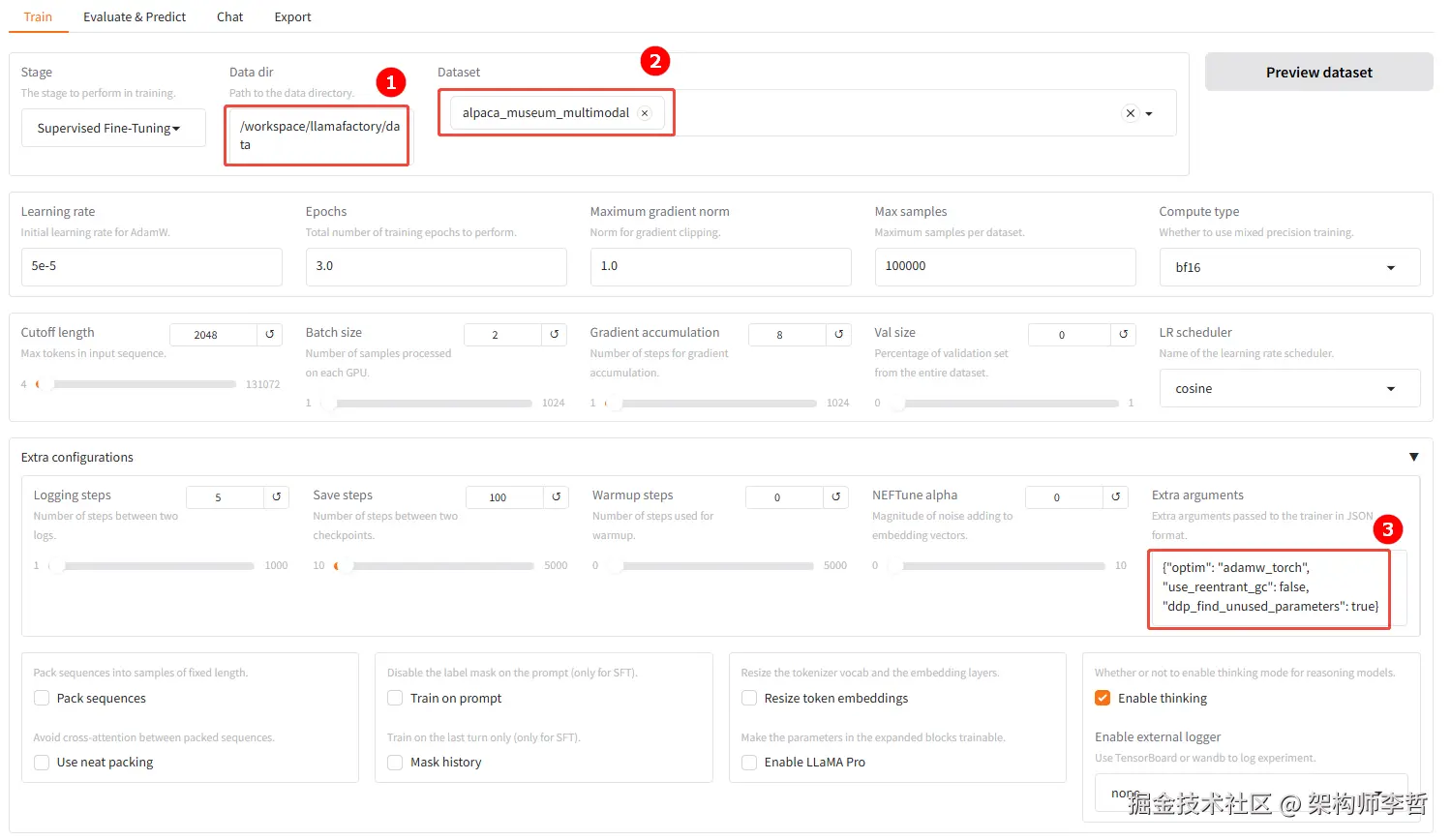 ● Extra arguments:需要设置use_reentrant_gc和ddp_find_unused_parameters,即设置为{"optim": "adamw_torch", "use_reentrant_gc": false, "ddp_find_unused_parameters": true},如图③。