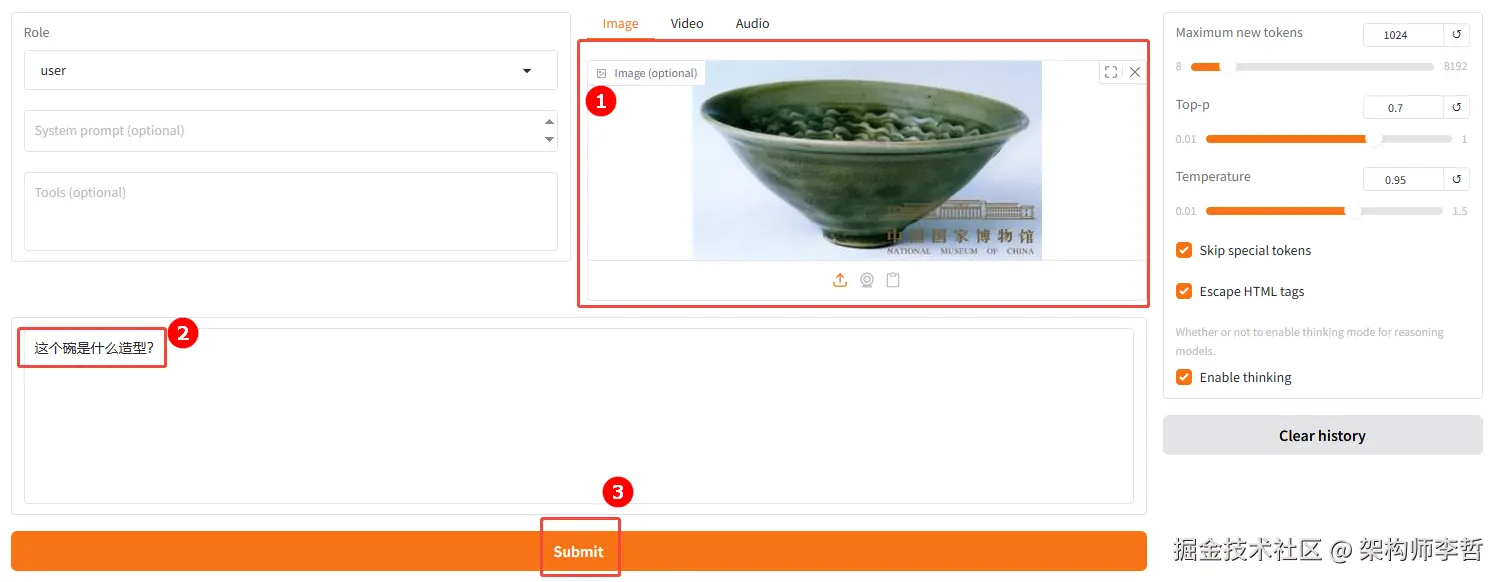 b. 使用原生模型进行对话。上传一张博物馆藏图片(如图①),并且输入您的问题(如图②),然后单击“提交(Submit)”(如图③)。