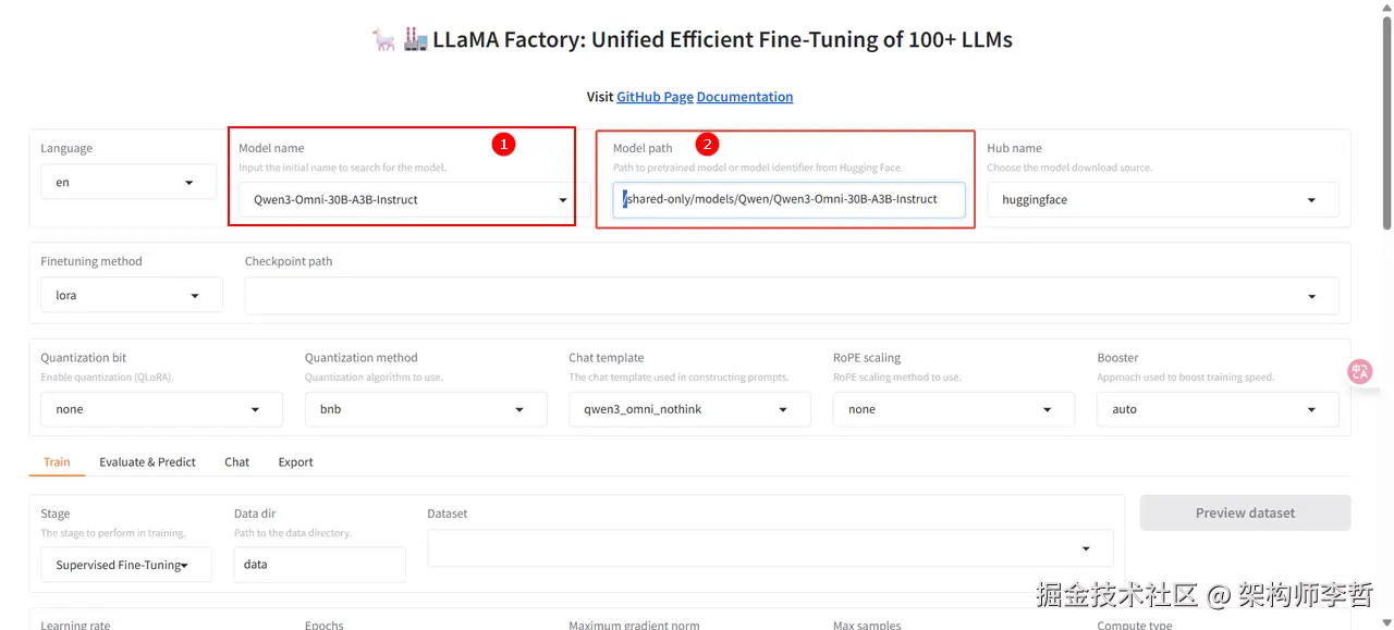 ● 数据集路径:设置为/workspace/llamafactory/data,如图①;