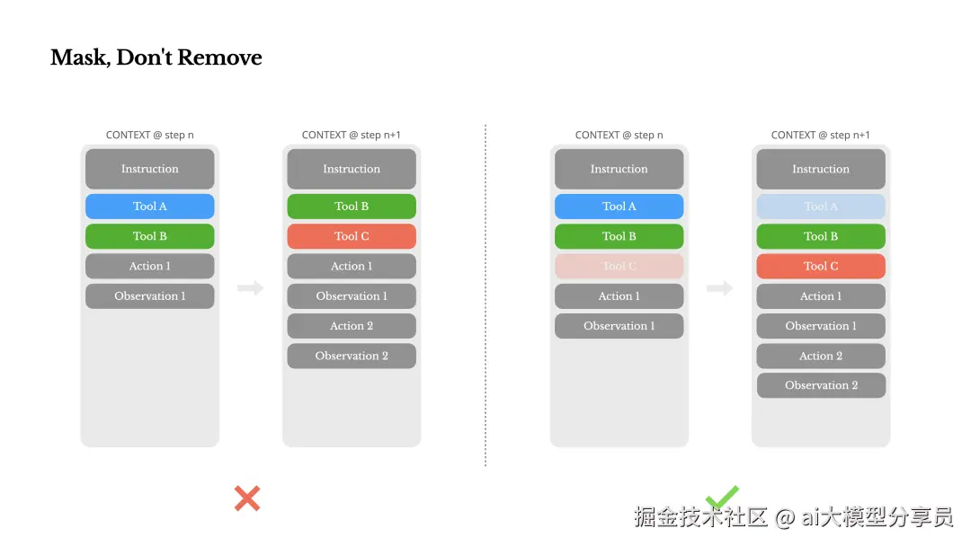 避免在迭代过程中动态添加或移除工具,因为这会影响 KV-cache 并可能导致模型混淆 [1]。更优的策略是: