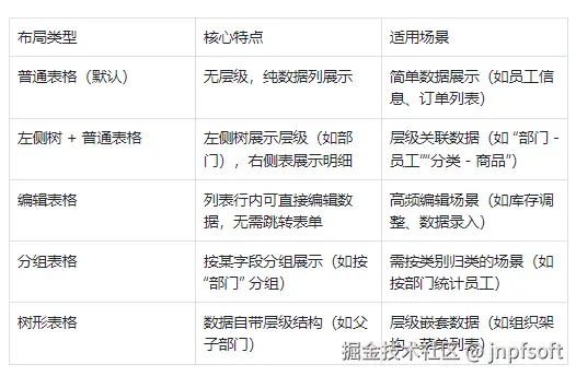 避坑提醒:分组表格不支持分页和合计,树形表格需确保数据有父子关联字段(如 “parent_id”),否则无法展示层级。