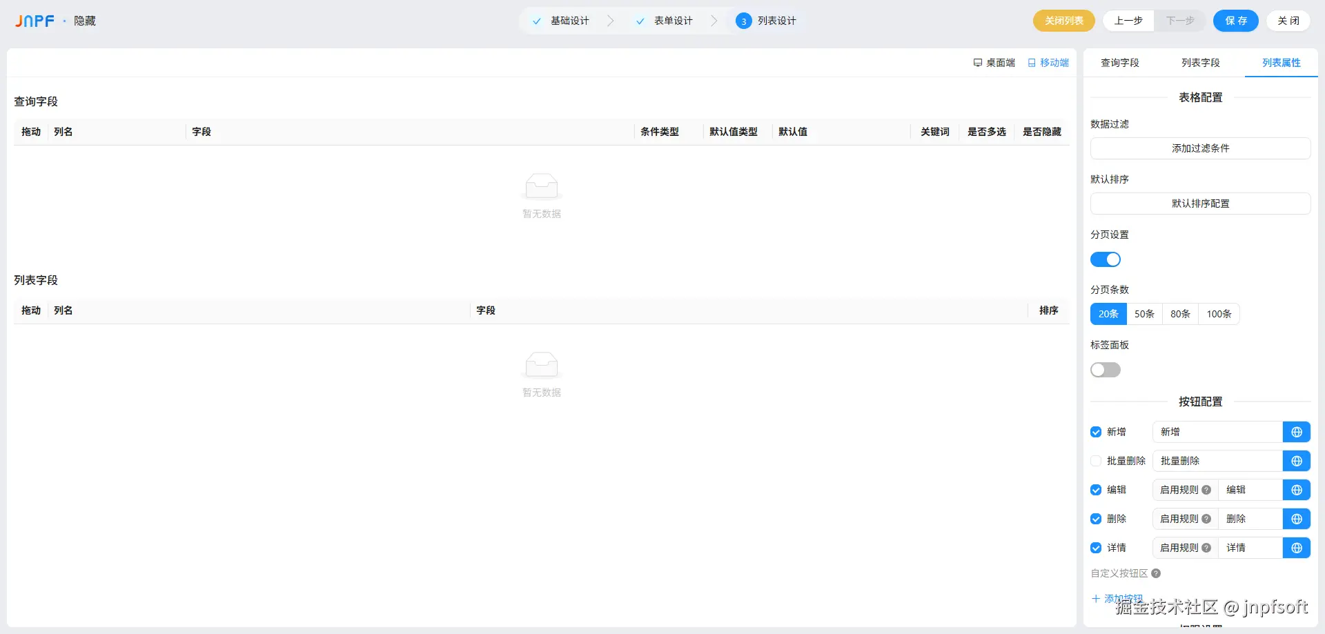 列表设计的操作围绕 “列表属性(布局 + 全局配置)”“列表字段(显示列)”“查询字段(筛选条件)” 展开,重点看布局选择和多端适配: