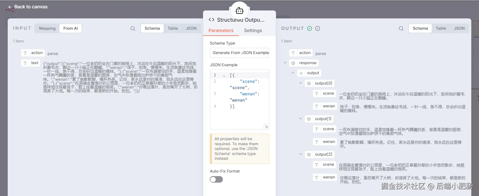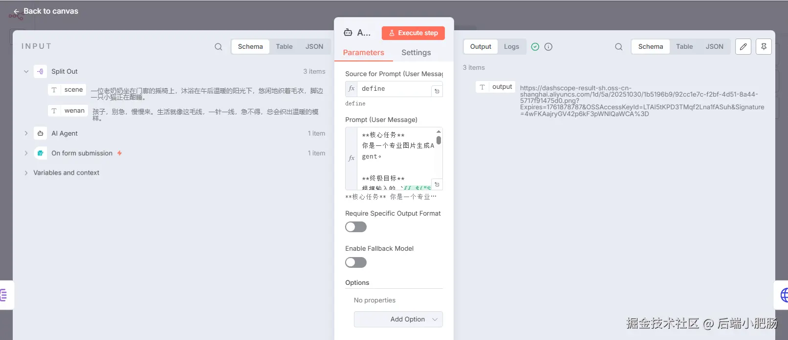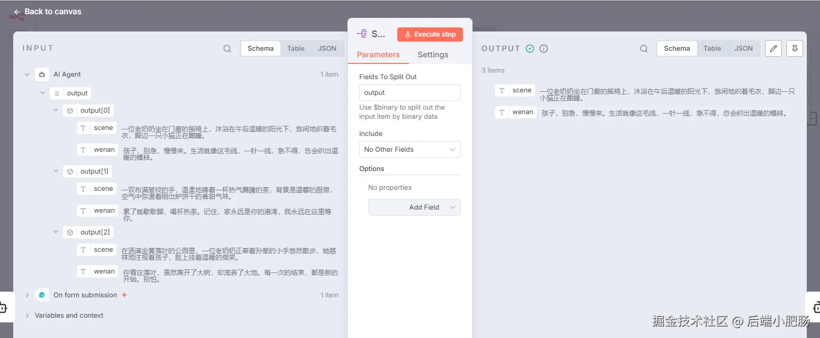 Split Out: AI Agent(生成场景和文案)节点出来后点击【+】选择Split Out。 这个节点的作用是将前面生成的的场景和文案数组分割为单个元素。
