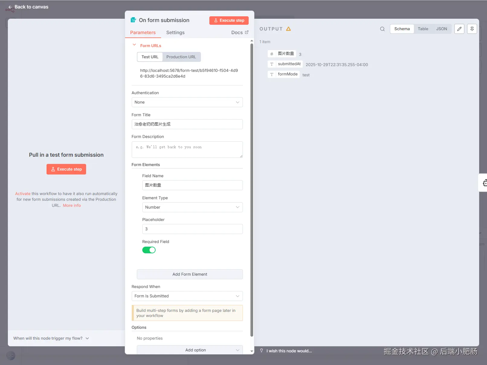 - 点击【Add Form Element】按钮新增表单元素,Field Name填写图片数量,Element Type填写Number,Placeholder填3,打开Required Field。