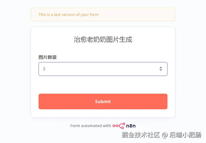 开始节点: 开始节点选择 On form submission,这个工作流需要通过表单提交,读取表单中种的图片数量来生成对应数量的治愈老奶奶图片。