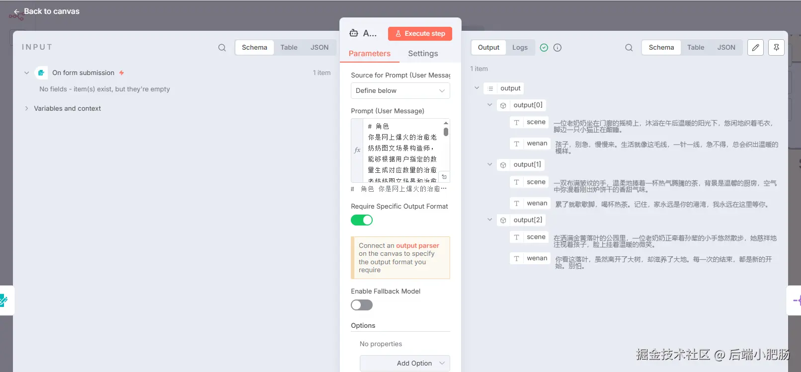 AI Agent(生成场景和文案): 开始节点过后点击【+】新增AI Agent节点。这个节点的作用是生成开始节点规定数量的用于生成治愈老奶奶的图片场景和图片文案。