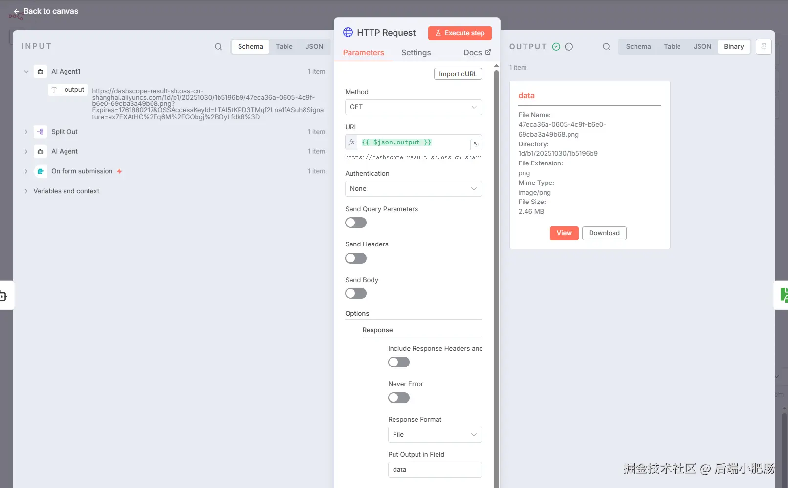 HTTP Request: AI Agent(生成老奶奶图片)节点出来后点击【+】选择HTTP Request。这个节点是作用是把前置节点生成的图片链接转换为文件。
