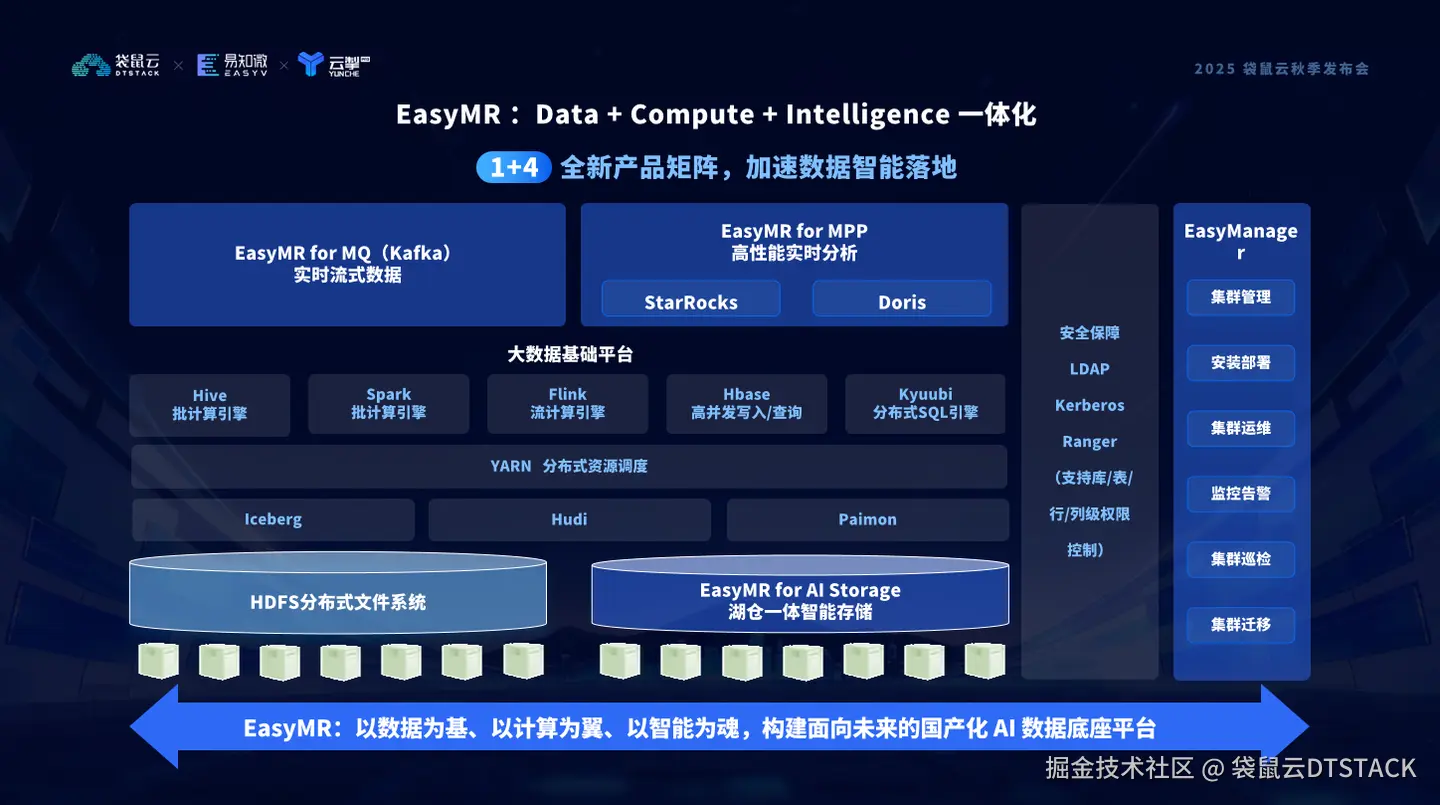 袋鼠云全新推出EasyMR“1+4”全链路产品矩阵,以 Easy Manager 智能运维平台为核心中枢,统摄大数据基础平台、EasyMR for MPP、EasyMR for MQ、EasyMR for AI Storage 四大核心引擎,形成覆盖数据采集、存储、计算、治理到AI训练与推理的全链路智能化数据底座。