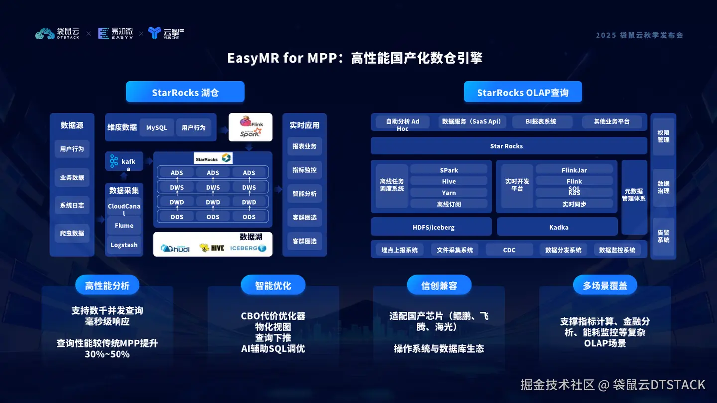 EasyMR for MPP既可以作为企业的主数据仓库,提供存储计算能力,也可以作为外部分析库,为已有仓库提供更强大的 OLAP 查询能力。在性能上,EasyMR for MPP 单节点支持数千并发查询,实现毫秒级响应,整体查询性能相比传统 MPP 提升 30% 到 50%。同时它具备 智能优化能力:CBO 代价优化器、物化视图、查询下推机制,再加上 AI 辅助 SQL 调优,让分析更智能,资源利用更高效。不仅如此,它还全面兼容信创生态,无论运行在鲲鹏、飞腾、海光芯片,还是国产操作系统与数据库环境,都能做到稳定、可控、安全。