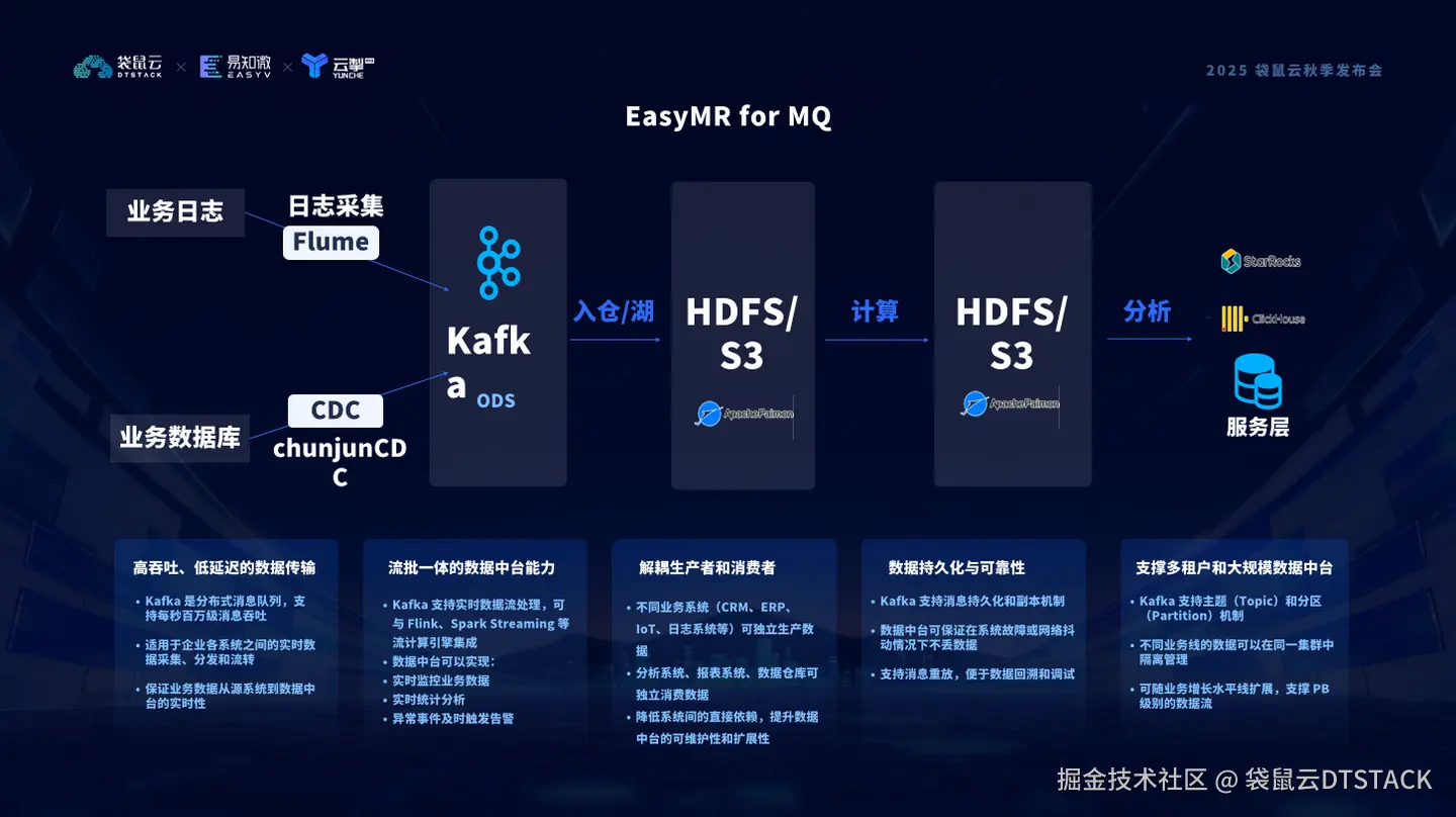 EasyMR for MQ 不仅能支撑每秒百万级消息的并发传输,还能与 Flink、Spark Streaming 深度融合,实现 流批一体化处理,让企业能够实时监控、分析、告警。更重要的是,EasyMR for MQ 通过 生产者与消费者的彻底解耦,让不同系统独立运转,极大提升了数据中台的可扩展性与稳定性。同时依托 多副本持久化与多租户隔离机制,即便在系统故障时,也能确保数据“不错一拍”。