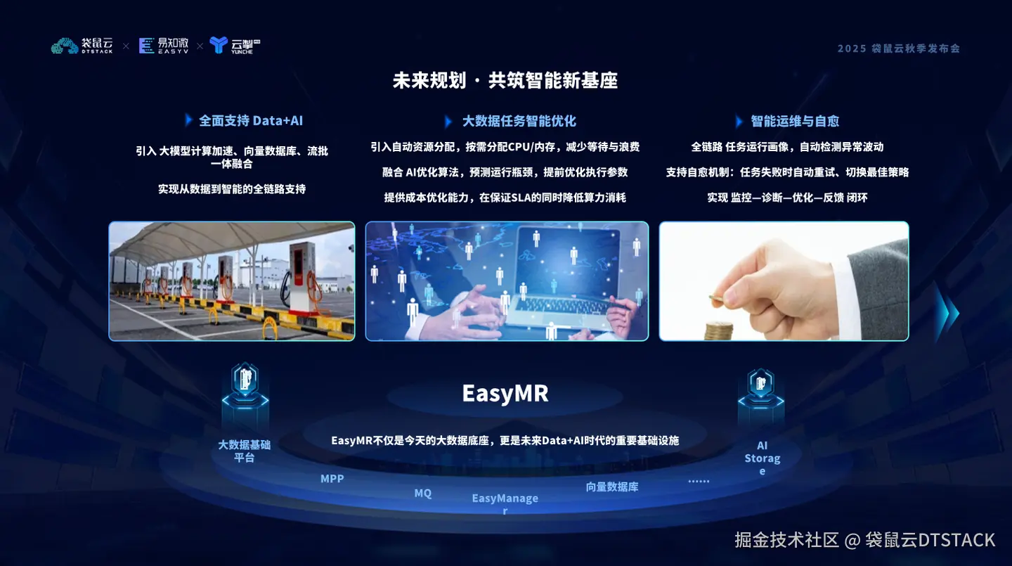 我们正在引入大模型计算加速与向量数据库能力,让AI算法能更高效地理解数据、生成知识。同时,持续强化流批一体融合,让实时与离线的边界彻底消失,真正实现“数据在流动中生长智能”。在集群运维层面,EasyMR 将引入智能调度与 AI 优化算法,减少任务等待与资源浪费,提升平台整体效能。