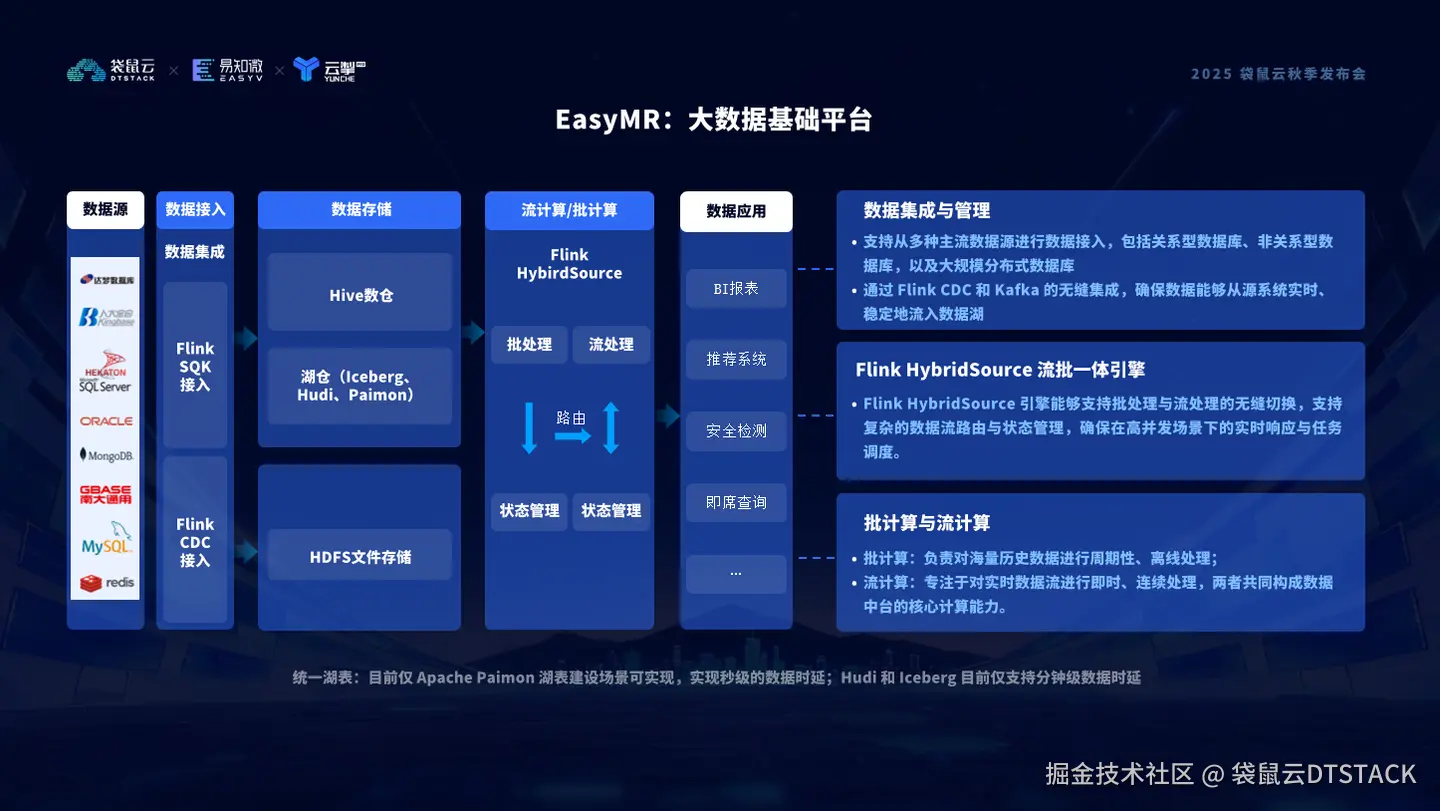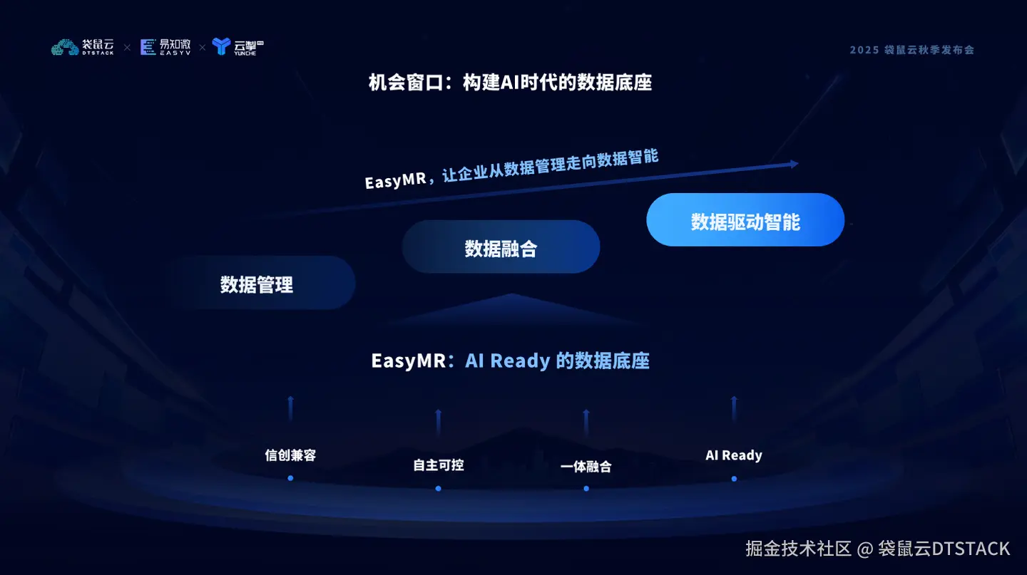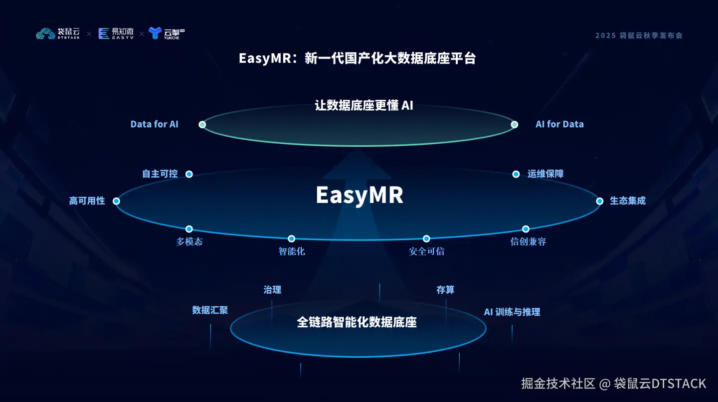 在这套底座之上,我们让企业的数据能够跨越结构壁垒,融合多模态信息,在统一架构中实现智能化处理、安全可信流转、信创环境兼容。更重要的是,EasyMR 不只是服务AI,它也在让数据底座真正理解 AI(Dataf or AI),并通过 AI for Data 反哺治理、优化资源、提升效率。