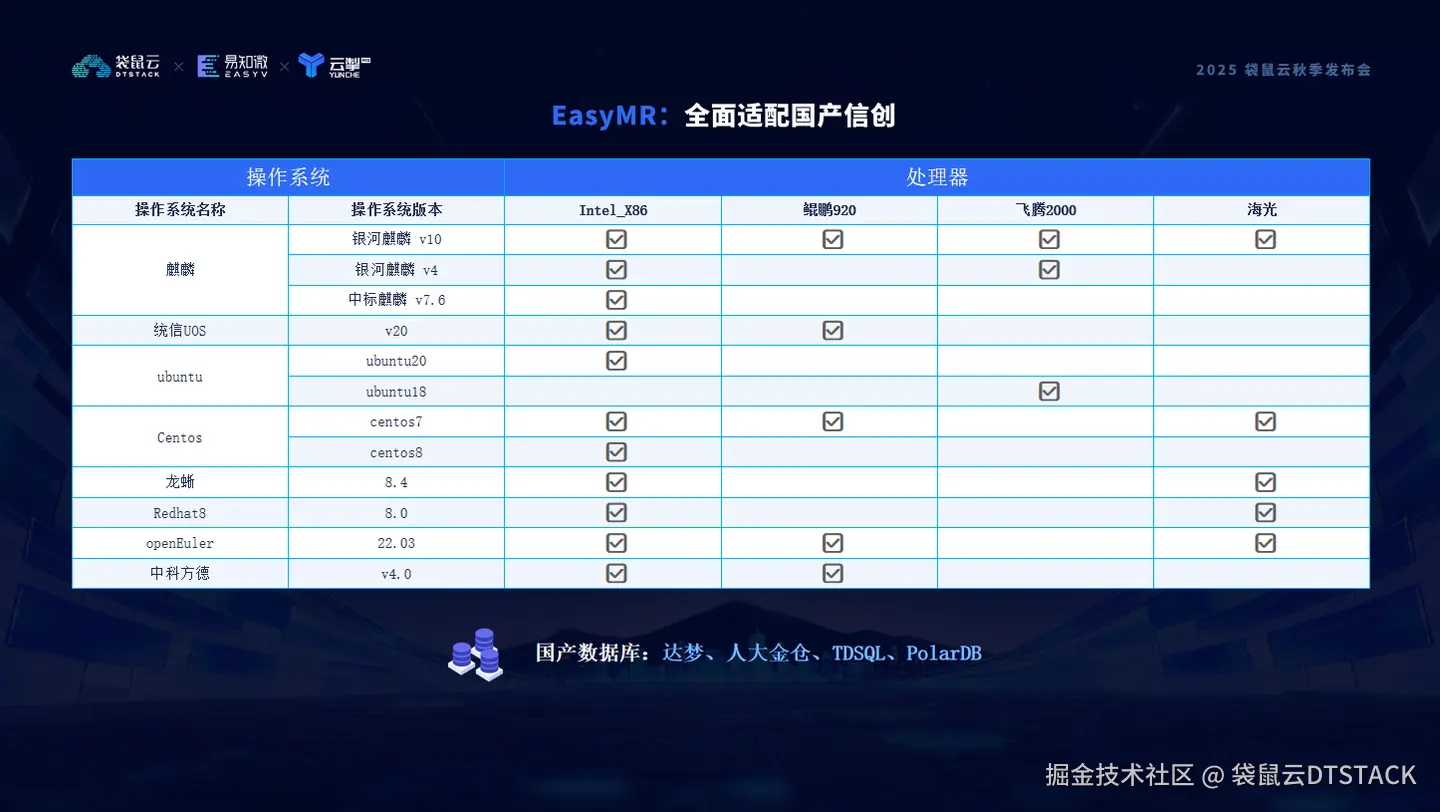 Easy MR 通过统一的存储计算架构、一体化的元数据与安全体系,以及全面的信创生态兼容,构建起支撑 AI 全链路落地的数据基础设施,真正让企业的数据为智能时代做好准备。