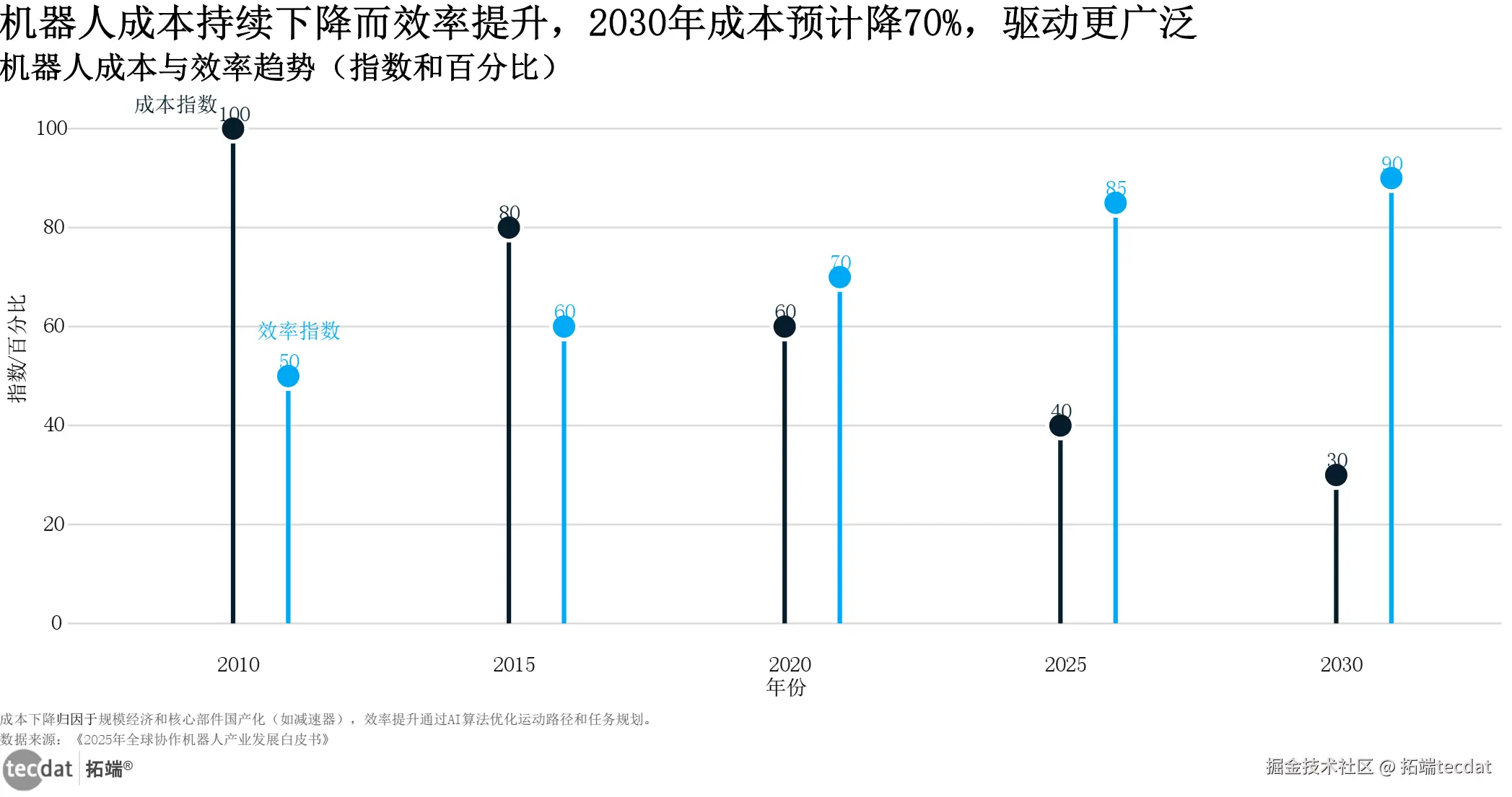 买机器人划不划算,核心看“成本”与“效率”的平衡。过去10年,机器人成本持续下降,效率却不断提升,2030年将迎来关键拐点——成本仅为2010年的30%,效率接近90%,这会让更多中小企业愿意“下手”。