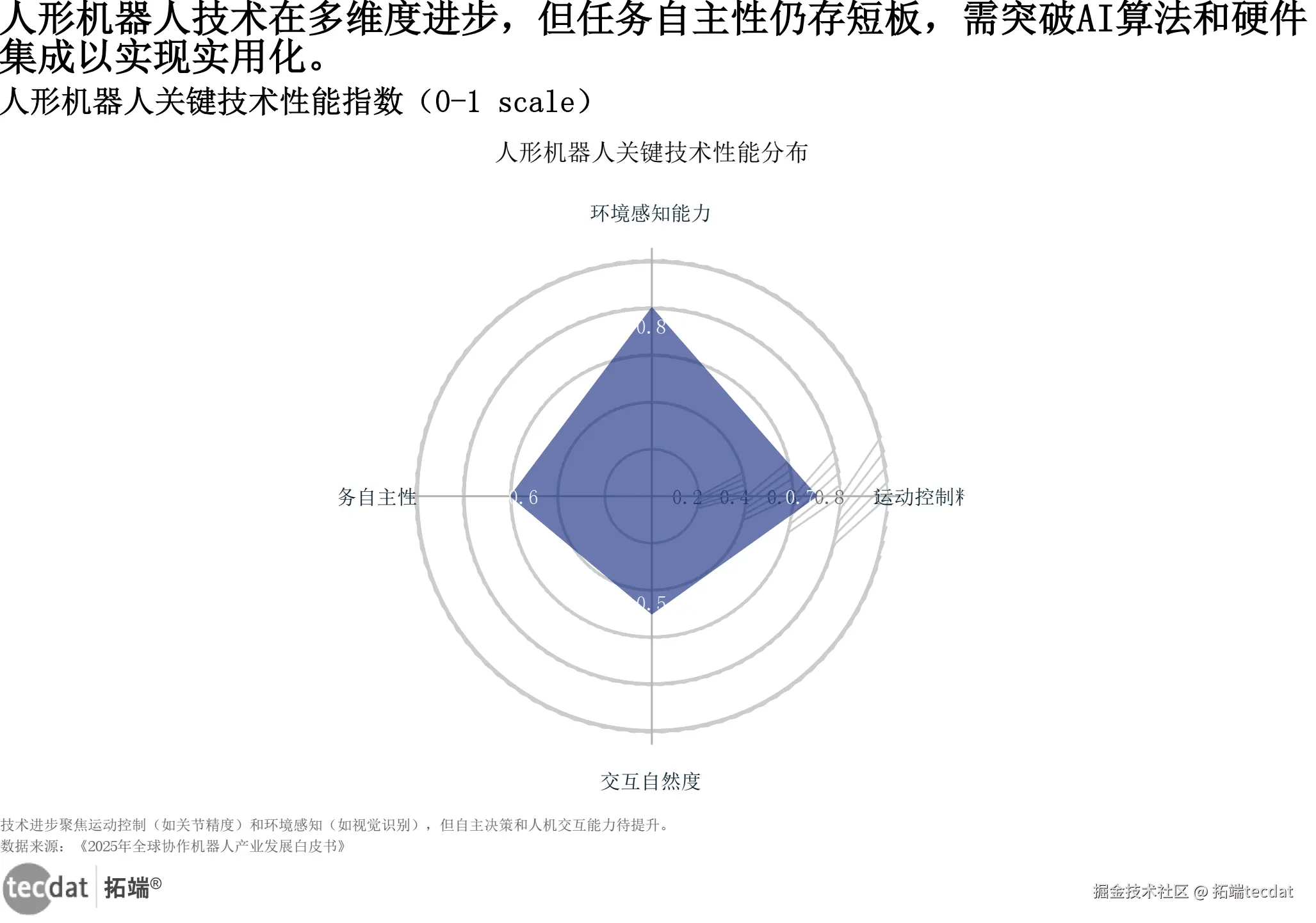 下图用0-1分的性能指数,拆解了人形机器人的“长板”与“短板”,每个分数都对应具体技术场景: