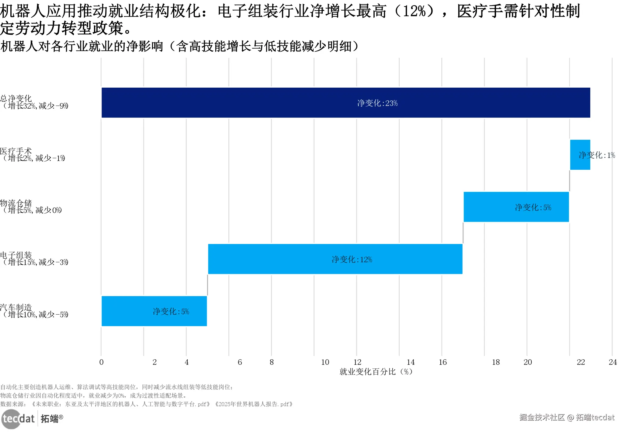 电子组装行业的就业增长最突出(15%),主要是机器人运维、算法调试等岗位需求爆发——深圳某电子厂2024年新增50个机器人运维岗,月薪比传统组装岗高40%;但低技能组装岗减少3%,净就业变化达12%。医疗手术行业增长最缓(2%),因为这类场景需要人类医生主导,机器人仅辅助完成“骨骼定位”等步骤,低技能岗位(如器械传递)减少也最少(1%)。