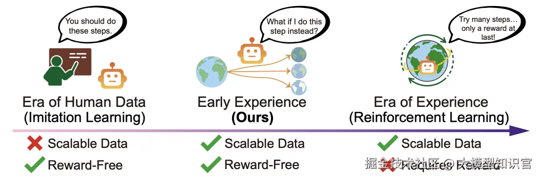 早期经验范式让智能体在专家数据的基础上,自主探索环境,执行非专家动作,并观察结果状态。这些状态变化本身成为监督信号,帮助智能体理解环境动态和自身行为的后果。这种方法既不需要奖励信号,又能突破专家数据的局限性,为智能体提供更丰富的学习经验。