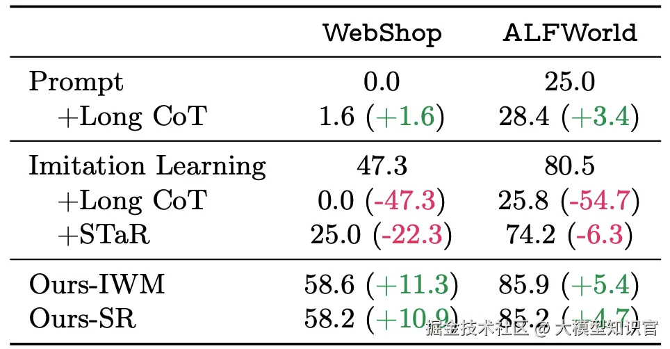 - 任务效果提升:平均绝对成功率提升 +9.6% 。例如,在WebShop任务中,隐式世界建模将成功率从47.3%提升至58.6%。
