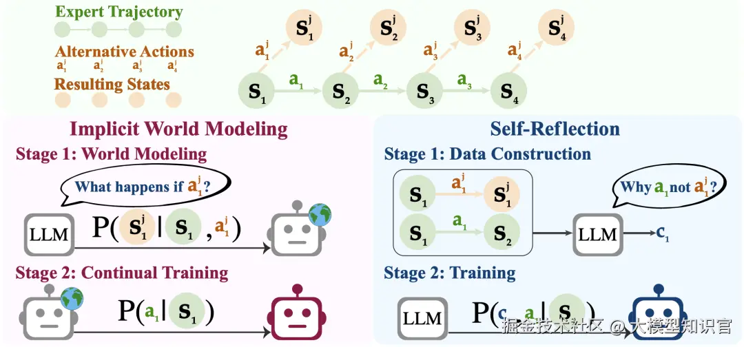 隐式世界建模将结果状态预测作为辅助任务,训练智能体理解环境动态。具体来说,模型输入当前状态和动作,学习预测下一个状态。例如,在网页导航中,模型学习预测点击某个按钮后页面会如何变化。