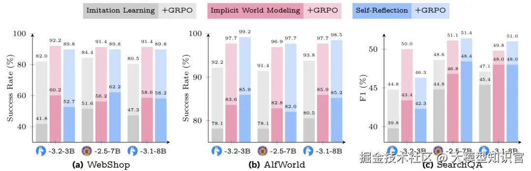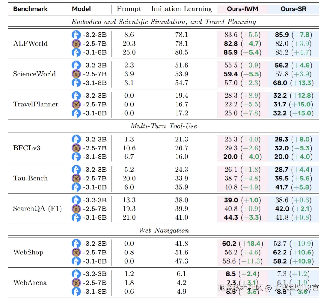 实验使用三种不同规模的模型:Llama-3.2-3B、Qwen-2.5-7B 和 Llama-3.1-8B。专家数据来自人类标注或高性能模型生成的轨迹。训练时,早期经验方法与模仿学习使用相同的优化步数,确保公平比较。