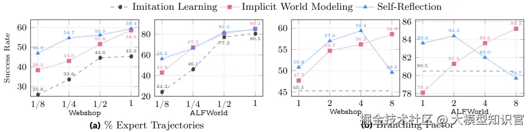 - 分支因子(K):隐式世界建模受益于更大的K(更多替代动作),而自我反思在K=2~4时效果最佳,过大的K可能导致反思质量下降。