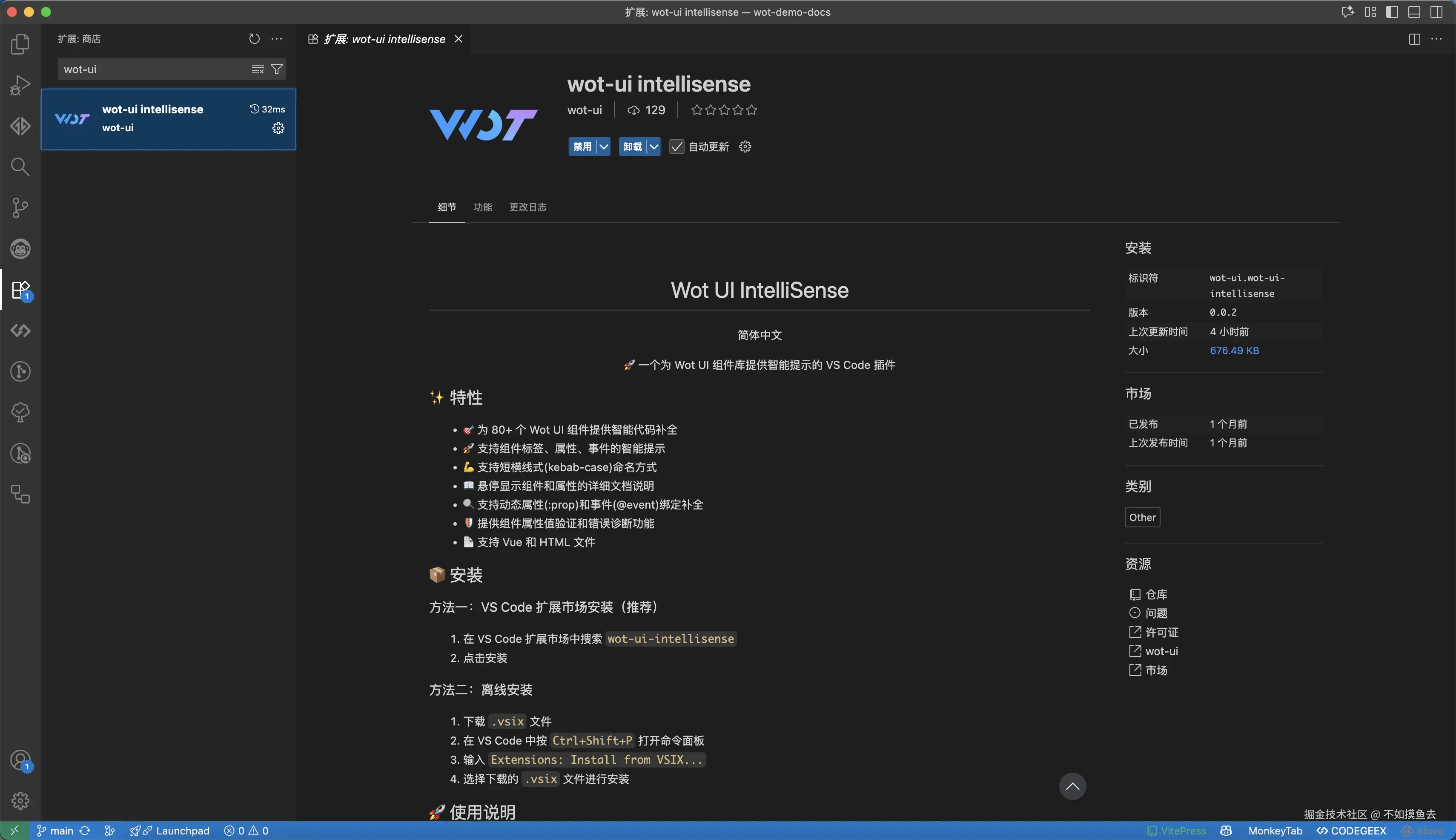 在文章 wot-ui 组件库 1.13.0 发布:组件、文档双优化,配套设施更齐全!中我们曾经提到,为了进一步提升开发体验,WotUI 1.13 版本推出了专门的 VSCode 插件,为开发者提供更智能的代码编写支持,今天我们来聊一聊 wot-ui intellisense 以及它是如何实现 VSCode 插件的自动化发布的。