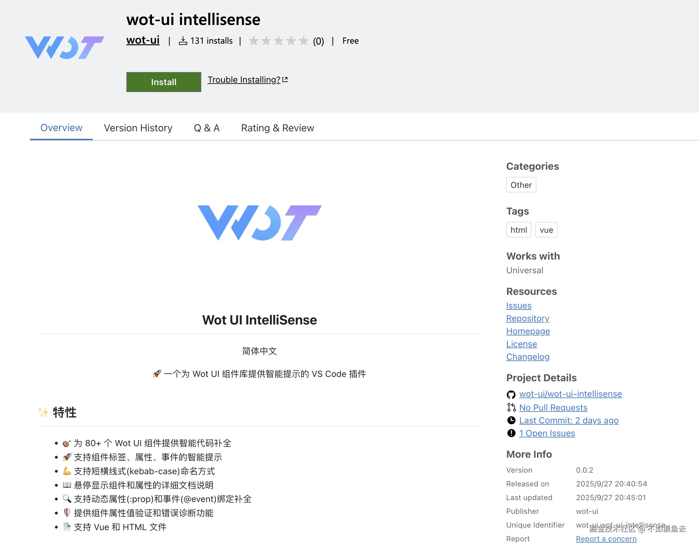 wot-ui intellisense 是一个为 Wot UI 组件库提供智能代码提示的 VSCode 插件,由 Wot UI 团队成员百友提供,它具备以下特性: