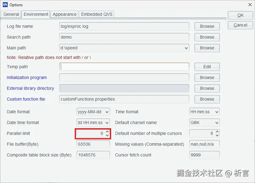 继续用并行技术提高性能,SPL 能方便地写并行代码,只要配置一下并行数,和 CPU 核数一致即可,这里配置了 8 并行。