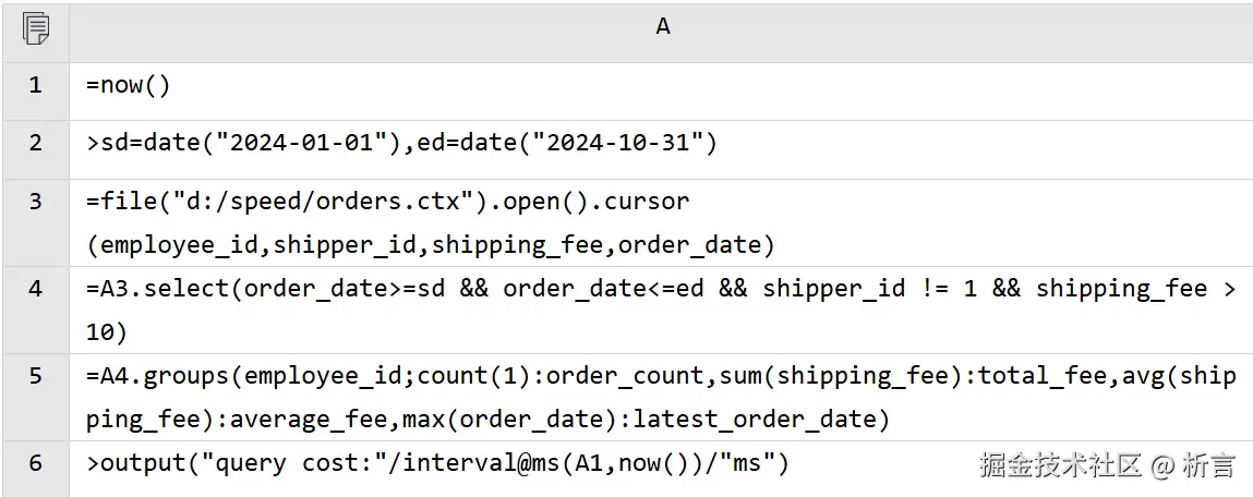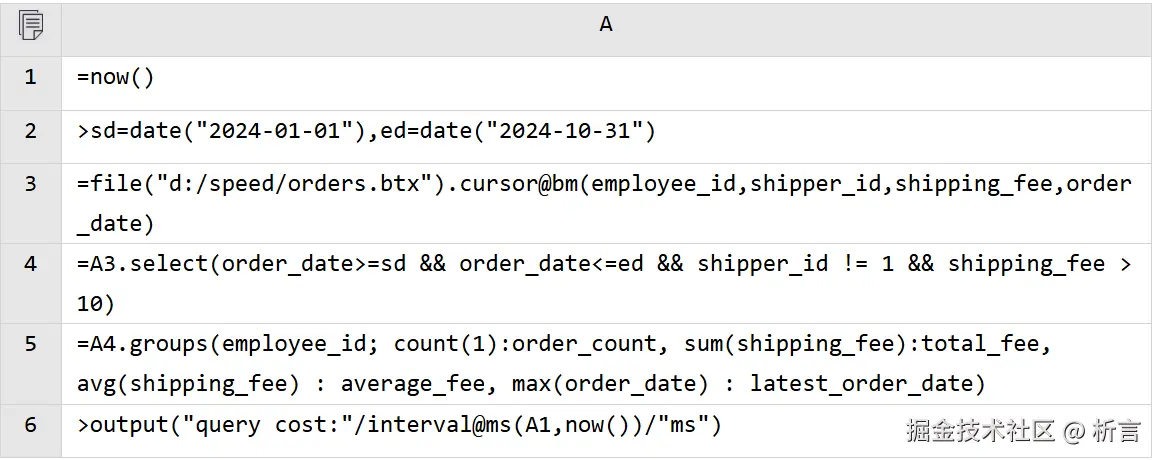 订单表比较大不能全部读入内存,这里 A3 使用的是游标,是分批读入数据,边读边算的。 注意,游标只取出需要的字段,可以减少生成的对象,并减少内存占用,提高性能。