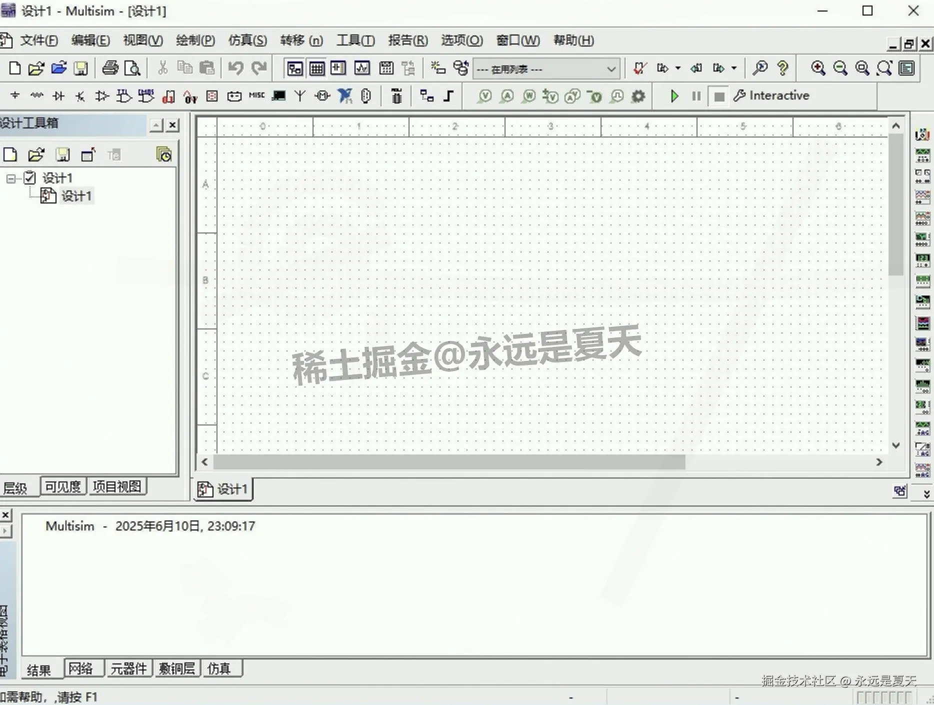 打开后看到界面是中文的,就说明 Multisim 14.3 安装、激活、汉化都成功了。随便拖个电阻、电源试试,能正常摆放和仿真,就可以开始用 Multisim 14.3 做电路设计了。