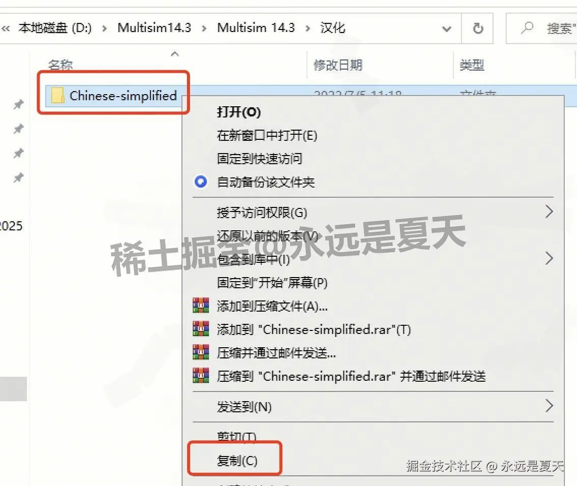 打开 Multisim 14.3 安装包里的【汉化】文件夹,找到【Chinese-simplified】文件夹,右键 “复制”。
