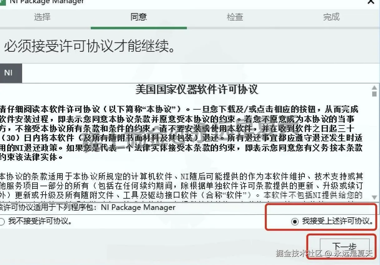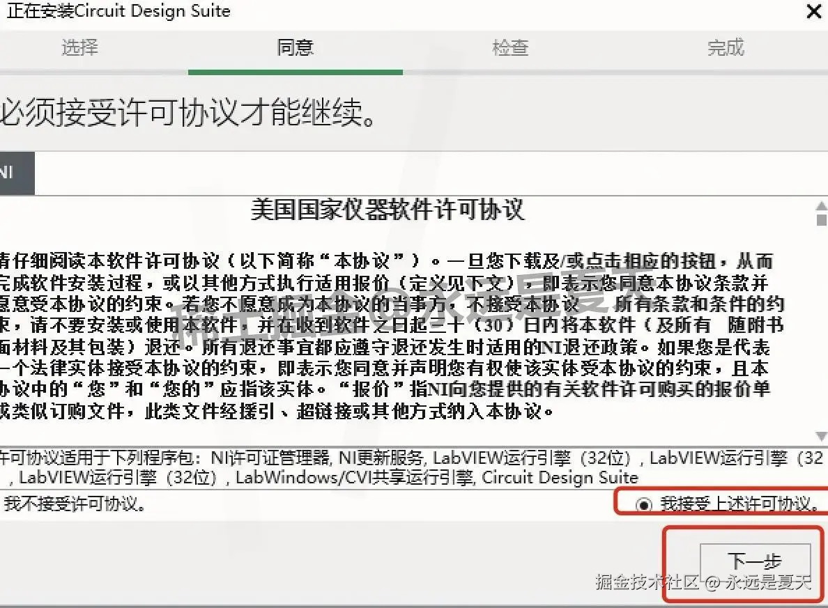装到一半会弹出新的协议窗口(是 NI 公司的配套组件,Multisim 14.3 必须用),勾选 “我接受”,点 “下一步”。