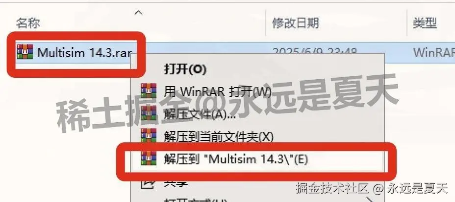 注意:解压路径别用中文(比如 “Multisim 安装包” 就不行),不然装 Multisim 14.3 时可能提示 “找不到文件”。解压完会有个文件夹,里面是所有安装文件,先别删,后面激活还用得着。