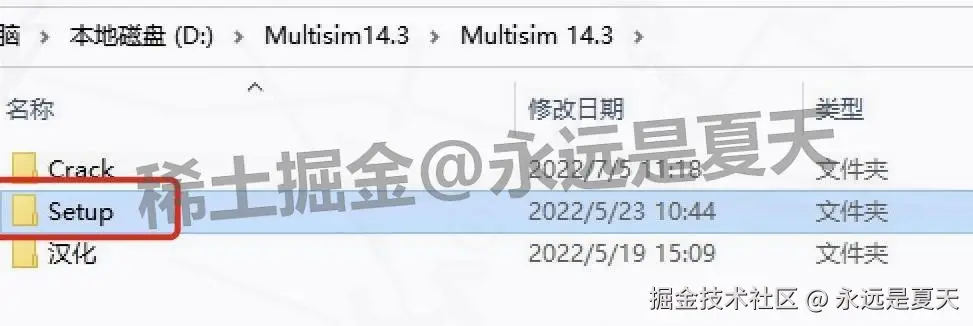 这一步很重要,Multisim 14.3 的安装程序都在这儿,从别的地方点容易出错,一定要从【Setup】里启动安装。要是找不到【Setup】,可能是解压错了,重新解压 Multisim 14.3 安装包试试。